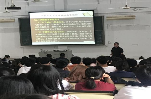 消防安全知识培训中,安全保卫处教师重点分析了学校当前消防安全形势、薄弱环节、常见隐患及学校火灾防范重点,并针对学校火灾特点、火灾原因、初起火灾扑救、逃生技巧等进行详细讲解。