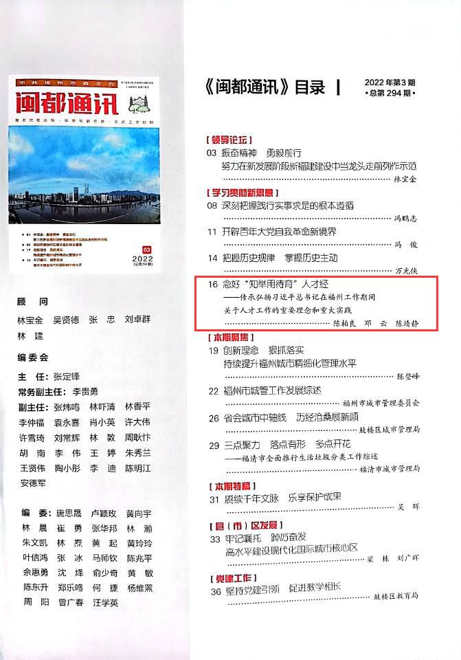 我校人力资源管理专业陈柏良副教授、邓云老师与2020级人力资源管理本科专业学生陈靖静一起合作联合署名撰写的学习贯彻新思想理论文章《念好“知举用待育”人才经——传承弘扬习近平总书记在福州工作期间关于人才工作的重要理念和重大实践》2022年2月14日发表于《福州日报》(理论版),该文章被中共福州市委主办的《闽都通讯》2022年第3期(总第294期)的“学习贯彻新思想”专栏全文转载刊登。