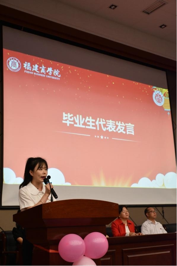 周晴晴和梁诗琪分别代表2022届本、专科毕业生上台发言。她们郑重承诺,要践行 “诚信、明德、允能、笃行”的校训,以百年闽商精神,共筑繁盛国家。