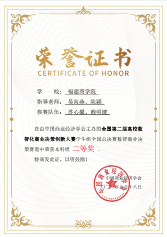 2023年9月,全国第二届高校数智化商业决策创新大赛在西安圆满落幕。本次大赛由国家一级学会中国商业经济学会主办,旨在培养学生的数智化商业决策能力和创新意识,为未来商业领域的发展培养优秀人才。在本次比赛中,福建商学院工商管理专业学生凭借出色的表现和扎实的商业知识,荣获佳绩。