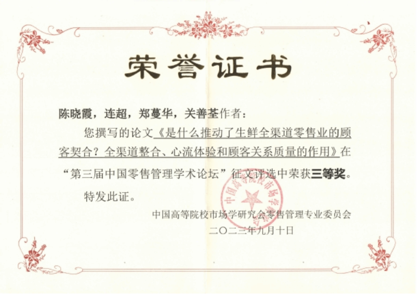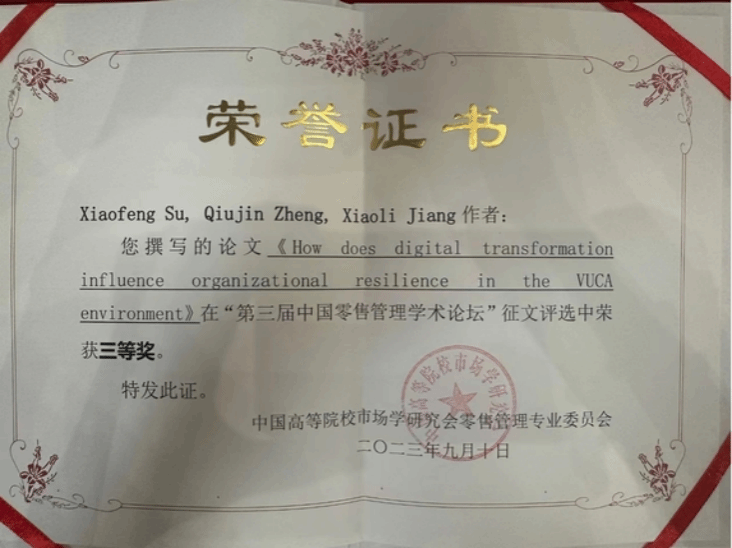 本届论坛我院教师苏小凤等论文《How does digital transformation influence organizational resilience in the VUCA environment》、陈晓霞等论文《是什么推动了生鲜全渠道零售业的顾客契合?全渠道整合、心流体验和顾客关系质量的作用》两篇论文在“第三届中国零售管理学术论坛”征文评选中荣获三等奖。