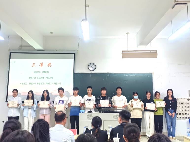 本次评比活动共有138间宿舍报名参加,主要以宿舍卫生、安全和日常表现为评比标准,旨在促进学生营造一个良好的宿舍生活环境。经过多轮评比,最终按综合得分,评出一等奖宿舍10间,二等奖宿舍20间,三等奖宿舍35间,吴思锋副书记与辅导员老师分别为获奖的宿舍颁奖,让我们一起来颁奖仪式现场看一看同学们的风采吧。