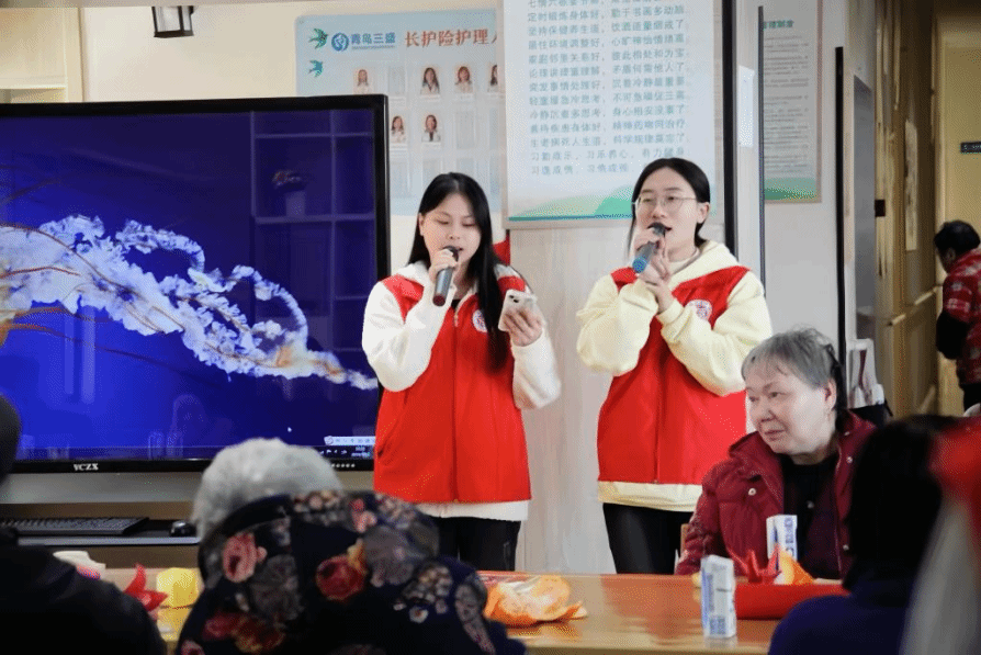 志愿者为老人演唱歌曲《我和我的祖国》与《明天会更好》,赢得了台下老人们会心的微笑和热烈的掌声,帮助老人保持身心愉悦。