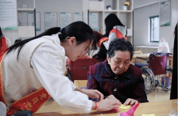 接下来紧跟志愿者们的脚步,一起看看温暖瞬间。志愿者一对一折纸教学,爷爷奶奶们跃跃欲试的手。颜色各异的千纸鹤、小兔子、花朵儿与他们的笑容一同展露。