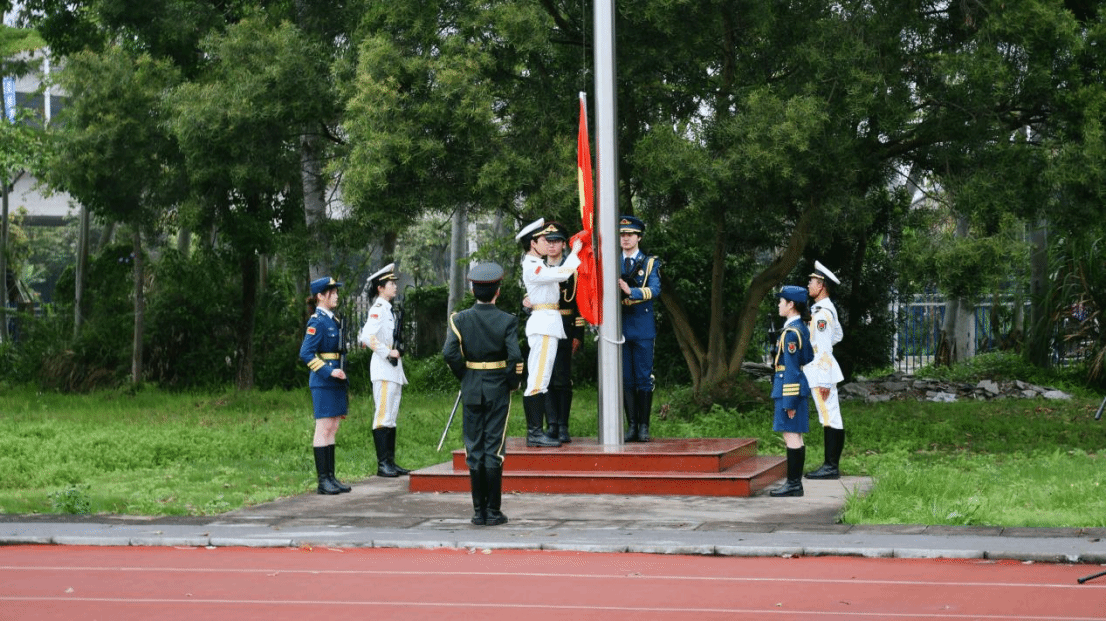 迎着冉冉升起的朝阳,国旗护卫队步伐整齐、铿锵有力,护送五星国旗走向升旗台。在庄严肃穆的气氛中,五星红旗伴随着国歌缓缓升起,全场师生向国旗行注目礼,表达对祖国的热爱和敬意。