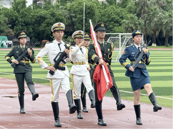 随着激昂雄浑的国歌声奏响,国旗护卫队迈着坚定有力的步伐稳步走向升旗台。在庄严肃穆的氛围中,五星红旗伴随着国歌的旋律冉冉升起。全体师生深怀对祖国的无限热爱和崇高敬意,向国旗行注目礼。