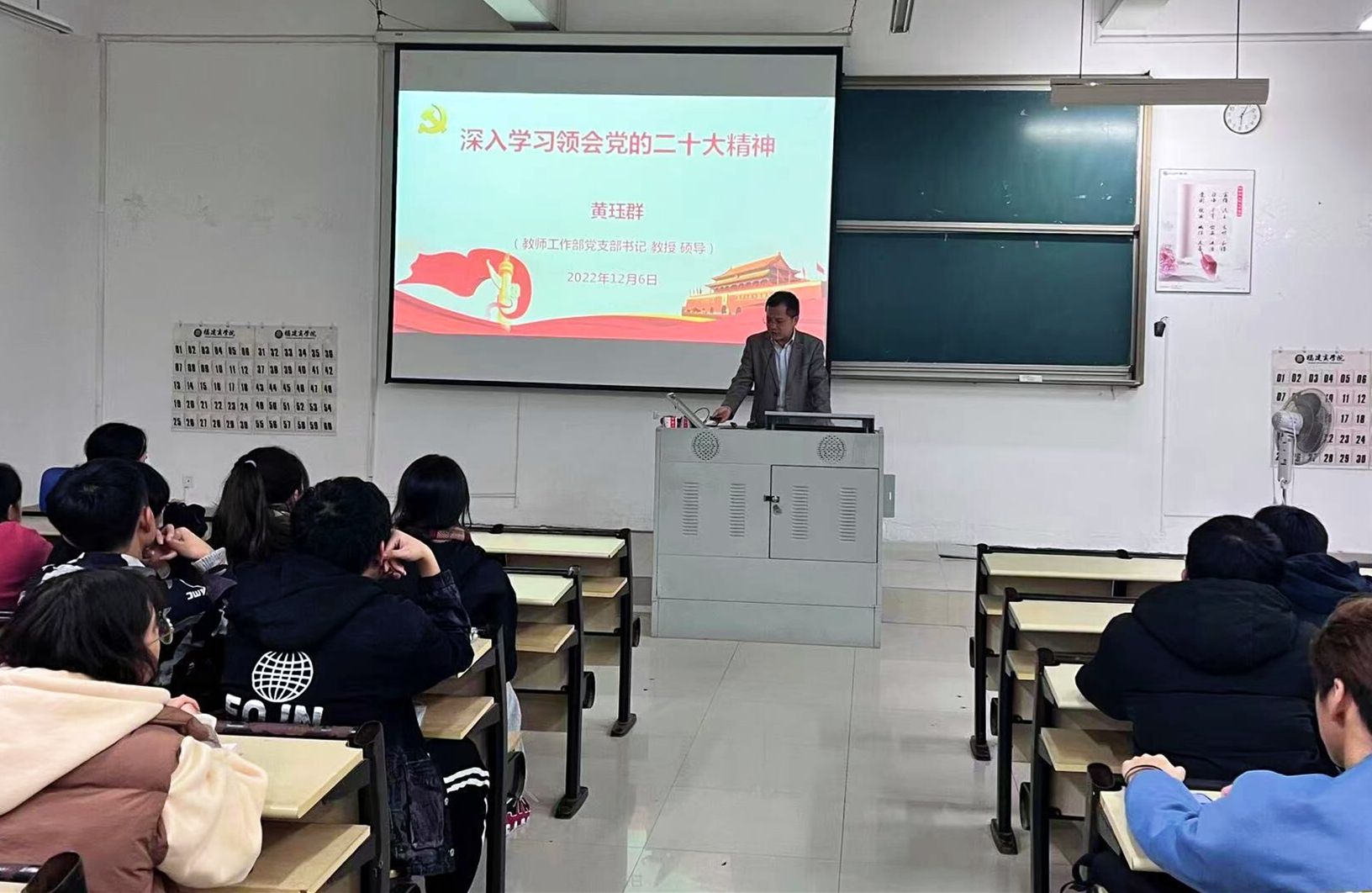 为深入推进党的二十大精神进班级,进学生头脑,根据学校“百名书记进班级宣讲党的二十大精神”工作安排,2022年12月6日晚,教师工作部党支部书记、硕士生导师黄珏群教授赴国产又粗又黄又爽又硬2022级物流管理专业班级宣讲党的二十大精神,讲座在马尾校区笃行楼T1阶梯教室举行,2022级物流管理专业1、2班共计110余学生参加了宣讲会。