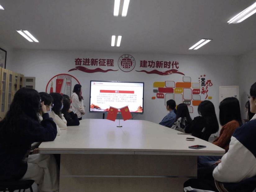 在本次活动中,供应链管理专业的邱佳倩同学进行了分享介绍,她主要围绕“党的二十大奋斗历程”、“回顾过去,展望未来”、“强国有我”等几大主题内容进行深刻阐释。活动中邱佳倩对社员们进行互动提问,社员们相互交流,踊跃回答,现场氛围活跃热烈,彰显了读书社社员们不忘初心、牢记使命、勤奋学习、勇于担当的精神风貌。