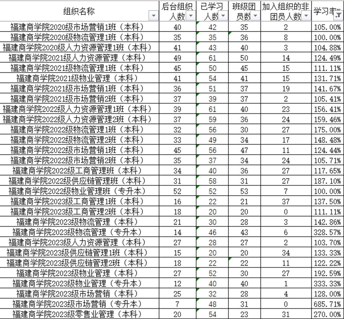 上一期青年大学习中,2020级市场营销1班,2020级物流管理1班,2021级人力资源管理班,2021级物流管理1班,2022级人力资源管理1班,2022级人力资源管理2班,2023级工商管理1班,2023级工商管理2班等29个团支部完成率达到100%及以上,特在此提出表扬!