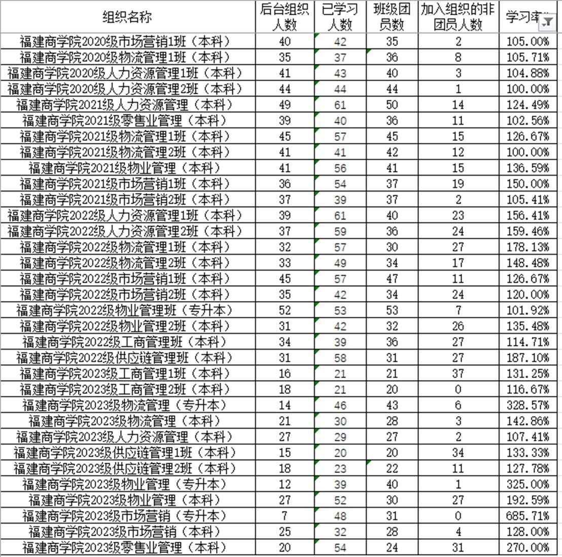 上一期青年大学习中,2020级市场营销1班,2020级物流管理1班,2021级人力资源管理班,2021级零售业管理班,2022级人力资源管理1班,2022级人力资源管理2班,2023级工商管理1班,2023级工商管理2班等33个团支部完成率达到100%及以上,特在此提出表扬!