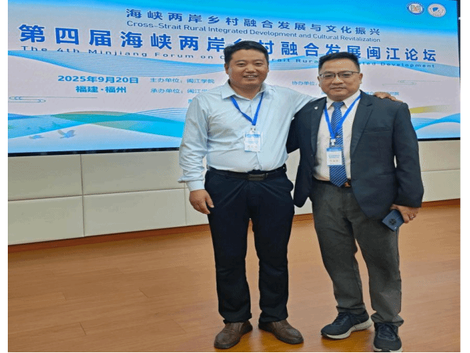 2025年9月20日,我院台籍教师、市场营销系副教授卢翊淮博士,受闽江学院乡村振兴研究院邀请前往参加第四届海峡两岸乡村融合发展闽江论坛,并做了《智慧农业冲击下的农耕文化新生》主讲发言。本届论坛由闽江学院主办,闽江学院乡村振兴研究院、厦门大学台湾研究院承办,中评智库基金会、闽江学院海峡两岸融合发展研究院、经济与管理学院协办。