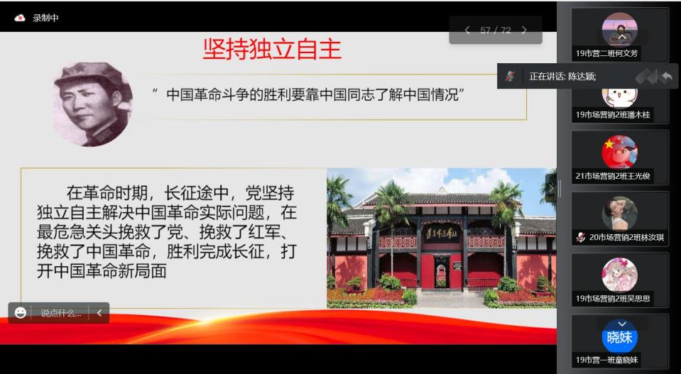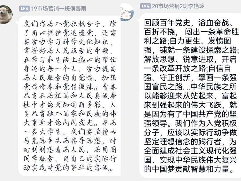 21市场营销1班饶唯加:通过党课学习,我深入了解了“三个历史决议”、“四个历史阶段”、“两结合,两确立”、“五大历史意义”等内容。学习党史既是继承与发扬党的成功经验和优良传统,也是领悟党的方针、坚定党的信念,通过对党的历史学习与总结,会有更深层次的领悟,也增强对党的认同感与归属感。作为入党积极分子,更应该多多学习党史,脚踏实地学习科学文化知识。