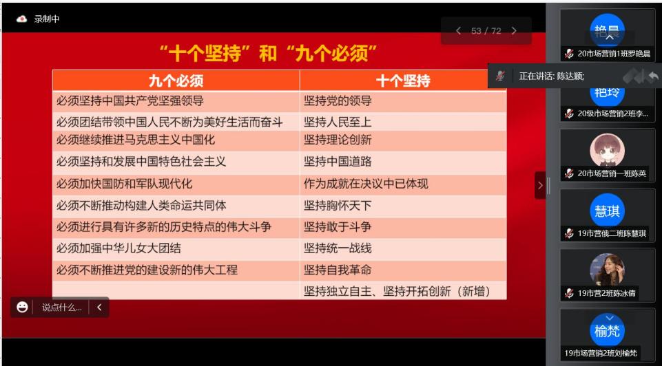 党课上,陈达颖书记带领大家回顾了党的四个伟大成就和中国共产党百年奋斗的历史意义,深入阐述了党的十九届六中全会的重要意义和丰富内涵,解读了全会精神的核心要义和实践要求,并勉励同学们把学习党的十九届六中全会精神与学习《闽山闽水物华新--习近平福建足迹》结合起来,坚定理想信念,做积极传播者、做模范践行者。