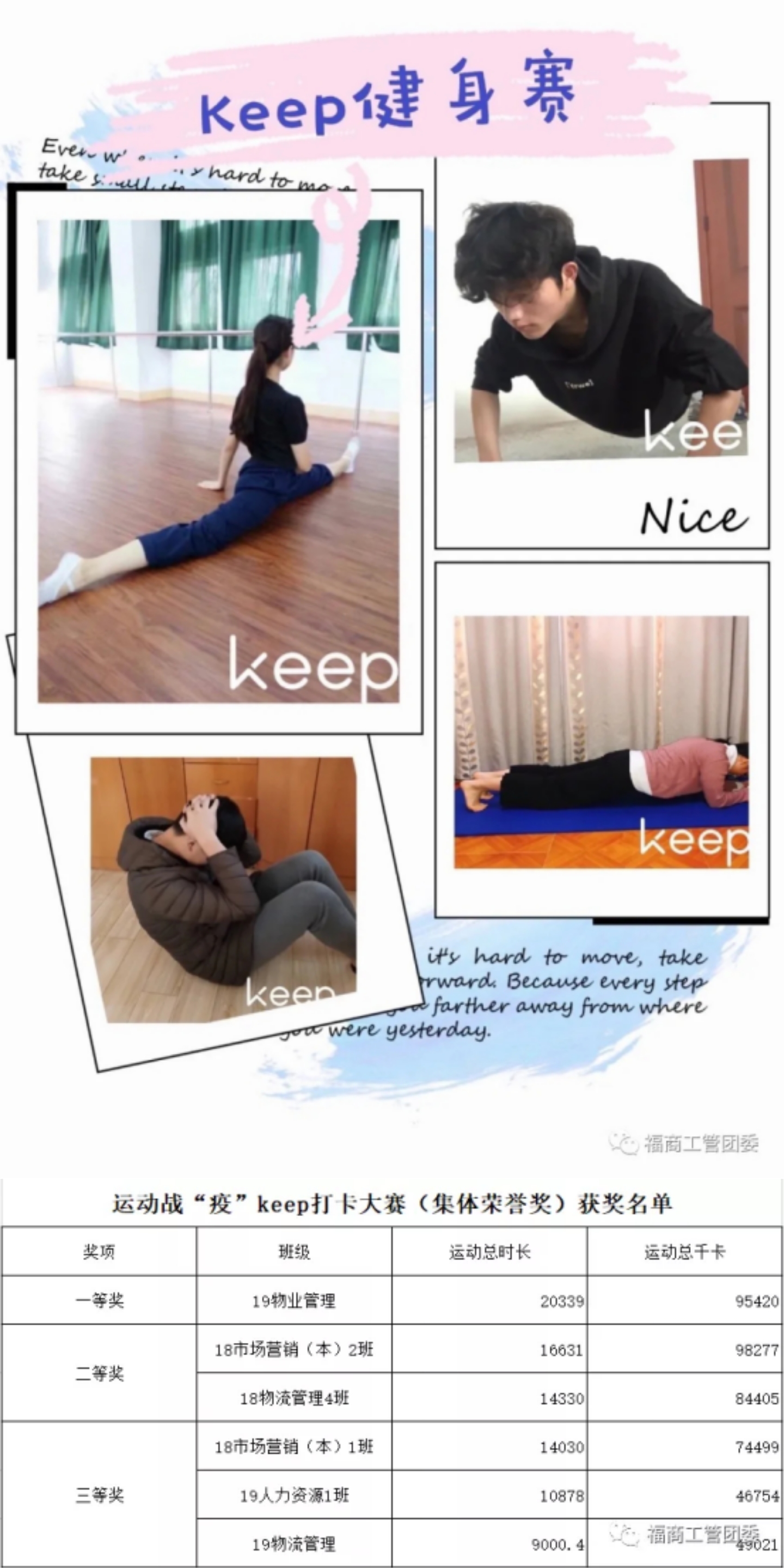 本次活动充分调动了学院学子对健身运动的参与热情和积极性,使学生在参与活动中,感受到运动的快乐,意识到健身锻炼的重要意义,从而培养长期运动的良好习惯,进一步在全学院营造“全民健身,有益身心,增强体魄,促进发展”的良好氛围。“没有机会看见这春天的人,给了无数人拥抱春天的机会”,为了进一步贯彻习近平总书记关于新冠肺炎疫情防控的重要讲话和落实福建商学院的体育运动精神,让福商学子们以更加昂扬的斗志,更加健壮的体魄,持续健康地投入疫情斗争和学习任务中去,国产又粗又黄又爽又硬开展了“运动战‘疫’工管在行动”Keep打卡健身活动。