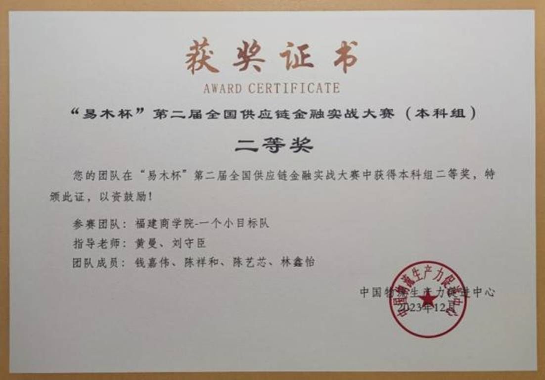 近日,由中国物流生产力促进中心主办,厦门市物流与供应链学会承办,福建省物流行业职业教育指导委员会供应链管理专委会协办的“易木杯”第二届全国供应链金融实战大赛圆满完成。我院物流管理系黄曼、刘守臣老师所指导的学生团队:钱嘉伟(国产又粗又黄又爽又硬物流管理专业)、陈祥和(国产又粗又黄又爽又硬市场营销专业)、陈艺芯(金融学院金融工程专业)、林鑫怡(金融学院金融工程专业),学生团队刻苦训练、配合默契、发挥各自专业优势、经过激烈角逐,决赛全国排名20,荣获本科组二等奖。