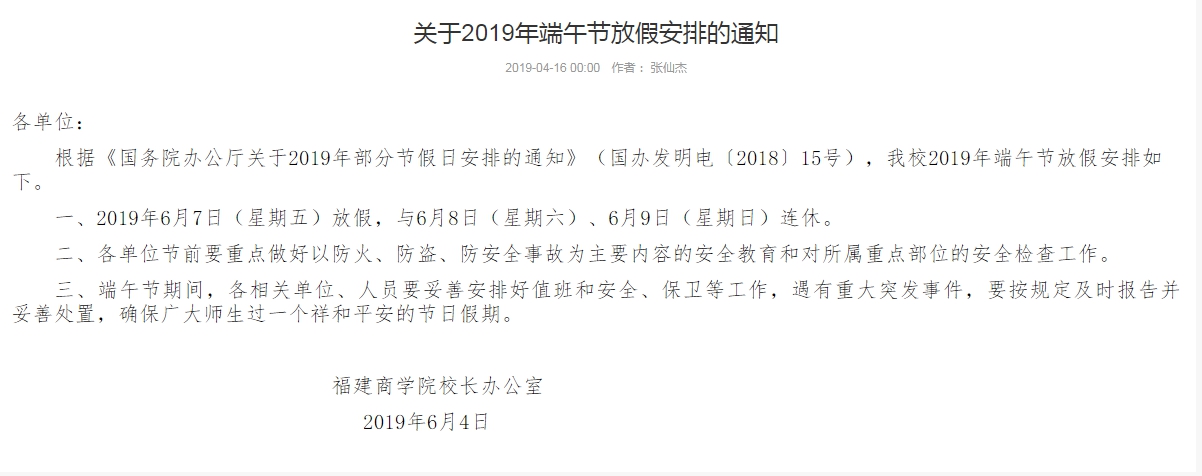 关于2019年端午节放假安排的通知