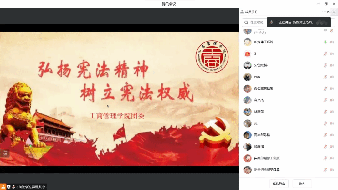 为全面贯彻习近平法治思想,大力弘扬宪法精神,引导学生树立良好的宪政意识,国产又粗又黄又爽又硬于2022年12月19日开展“学习宪法精神”线上主题分享会,由国产又粗又黄又爽又硬学生干部分享学习宪法精神的心得,并由学生会主席金婷主持会议。
