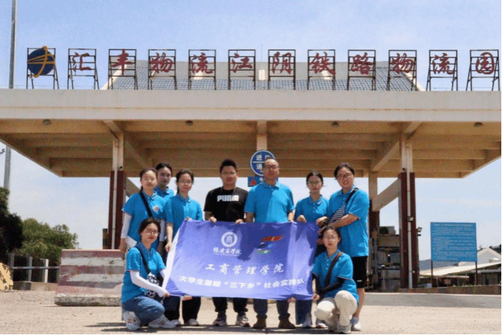 在铁路物流园大门口,詹经理向实践队员们介绍了江阴铁路物流园区建设与运营基本情况。据介绍,铁路物流园约2200亩,具备海铁联运、公铁联运、商品汽车、集装箱、大型仓储配送等功能。今年一季度,海铁联运到发箱量累计完成1.18万标箱,比增92.24%。